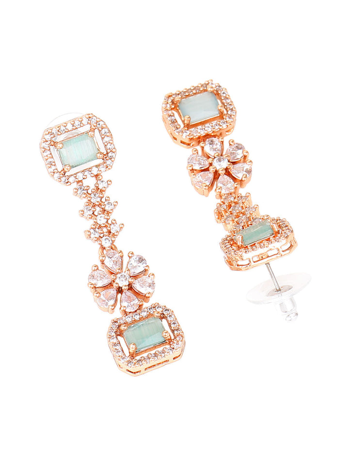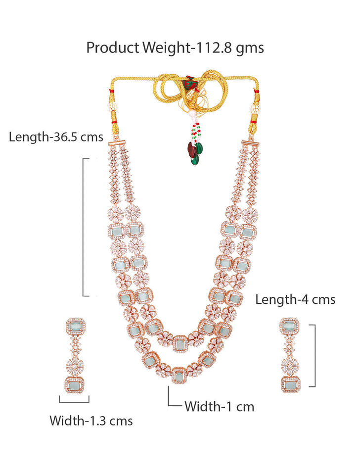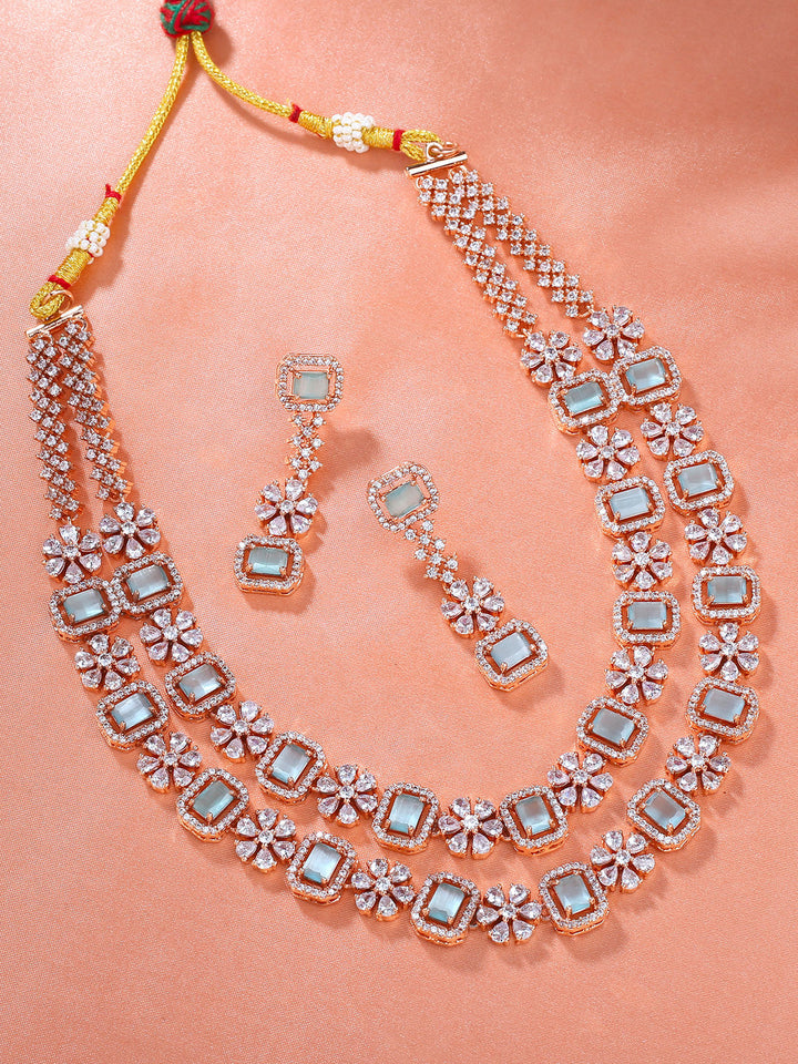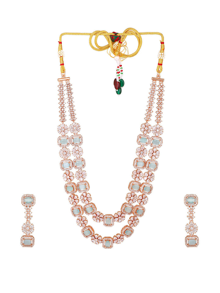 Rose Gold Plated Cz Two Layered Necklace Set with Mint Green Stones for Women (Set of 2)